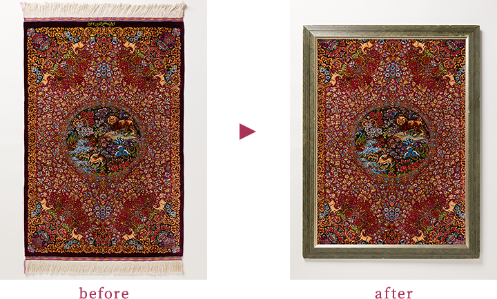 美しい絨毯をタペストリーのように掛けたり、額装することで壁に飾ることができます。新しい絨毯を買ったけれど、これまで使ってきた絨毯も手放し難い、愛着がある、という方にもお薦めです。額縁の種類などにより料金が異なりますので、ご相談くださいませ。