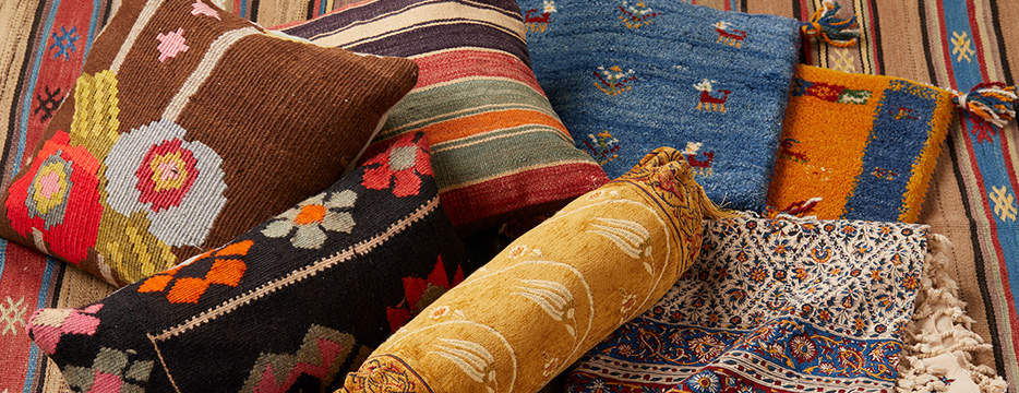 キリムなどの布地を使ったクッション、ピローや、テーブルウエアとしてもつかえる小さな織物なども揃えています。